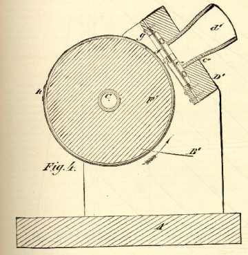 The shaft, A, is journaled in wooden standards, C, which are 1x1 � in. in transverse section. The distance from the base piece to the center of the shaft is 3 � inches. The base piece is 7x11 � inches face and 1 inch thick.
