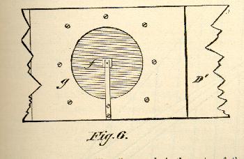 The position of the support, G, is regulated by the screw, e, which passes through it and rests against a metallic button, which is inserted in the stop piece, F.