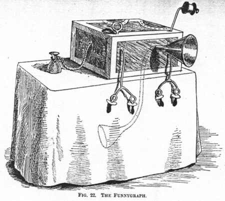 I shall now make a Record, and let you hear for yourselves how faithfully the apparatus repeats any sound submitted to it.  To select a familiar illustration, I shall imitate two English swells asking each other the way about London.  You might notice how well I imitate the English swell.  Of course, I don't want to offend anyone present, you quite understand this is science, it is not impertinence--there's not much difference, but it is science really.  (Speaking with American accent into egg-cup) "Well, Guss, are you going up Pall Mall or are you going up Piccadilly?  Yah!  Yah!  Yah!  (Pause and phonograph repeats.)  A little imitation of laughing and crying may perhaps amuse you more.  (Into egg-cup)  Can you--(to audience) of course it can't--I'm only asking it that to make a kind of conversation of it and get you interested.  (Into cup) Can you laugh, Mr. Funnygraph?  Ha! ha! ha!  Can you cry, Mr. Funnygraph?  Oh! oh! oh!  (Phonograph repeats.)  The last "Record" will not be a record at all.  I'm going to sing; you needn't get up and go out, I sha'n't sing very much.  I shall just sing a little song, written and composed by an American, called "The Last Rose of Summer;" it is a very nice song when you hear it, as you doubtless do to-night, for the first time.  (Sings into cup) "'Tis the--(to audience) I'm sorry I haven't a better voice, but you quite understand that this is not a concert that is going on now, it's a scientific lecture; you're learning something now, it's not like a lot of tomfoolery (taking up egg-cup and singing into it).  "'Tis the--" (to audience) of course, if I had a better voice I should use it.  I am doing the best I possibly can with what Nature has provided me with, and I can't do more than that--if I had a voice like Santley or Sims Reeves I shouldn't be playing the fool here, I should be at the Albert Hall.  (Mouth to egg-cup, and then to audience) You understand this is a scientific voice, quite good enough for science.  (Sings.)  "'Tis the last rose of summer, left--" (phonograph concludes "blooming alone.")  You see, ladies and gentlemen, it not only repeats things, but finishes a song, words and all, it never heard before, and concludes my lecture on the Funnygraph.